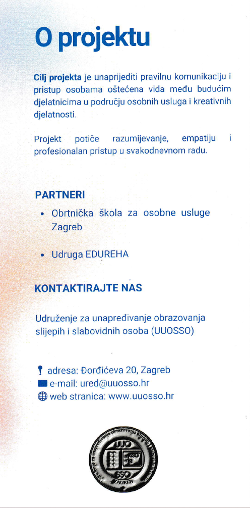 Studentice edukacijske rehabilitacije sa ERF-a Zagreb, ujedno i članice udruge Edureha su kroz interaktivan rad, razvijali razumijevanje o tome kako na primjeren, siguran i empatičan način zaposlenici uslužnih djelatnosti mogu pristupiti slijepim i slabovidnim osobama u svom profesionalnom okruženju. Naglasak je bio na svakodnevnim situacijama u salonima i studijima, od prvog kontakta s klijentom oštećena vida do pružanja same usluge.